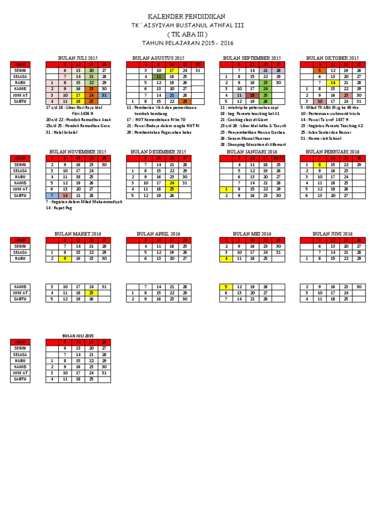 Kalender Pendidikan TK Aisyiyah Bustanul Athfal III Tahun Pelajaran …